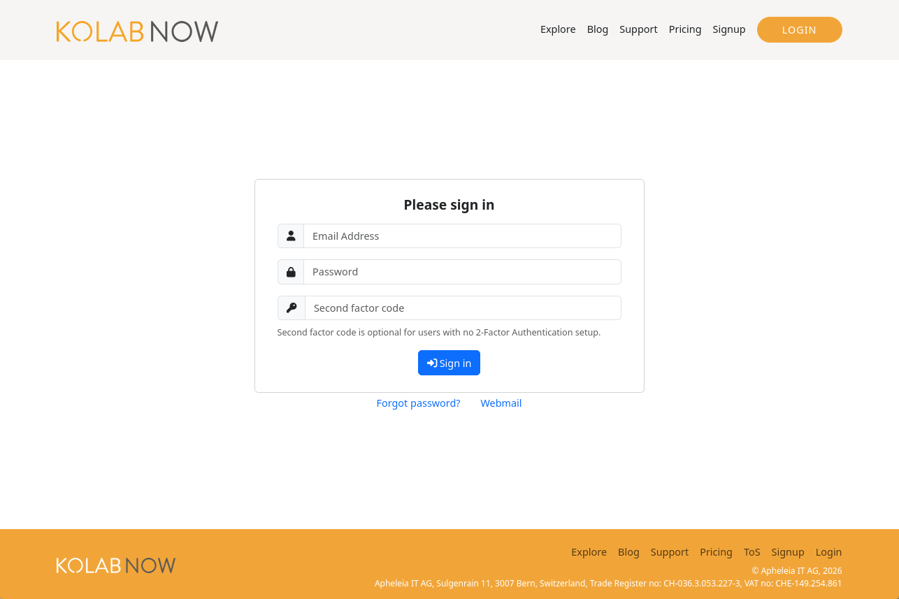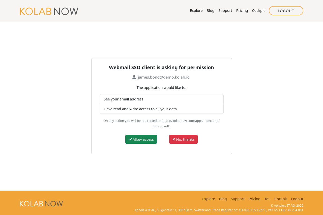 If you’re not logged into the cockpit, have not given the permission to enable the SSO (with the screen above), and take the direct link to the webclient (‘https://kolabnow.com/apps’), then you will have to log in to the webclient. If you however are logged in to the cockpit, have given the permission once, you make use of the direct link to the webclient, then you will be logged in automatically.
